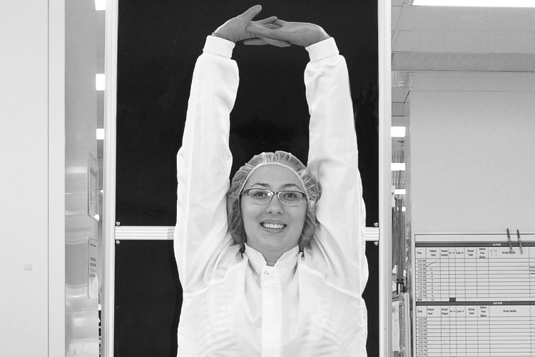 A few of the medical device specialists who work on the line also serve as the models for the posters and handouts, demonstrating the stretches step-by-step in the photos and dressed head to toe in clean room gear—including gloves, hair net, face mask and lab coat.